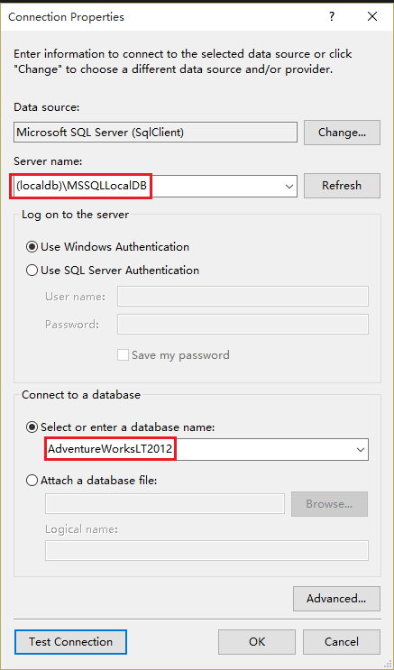 9.In the Connection Properties dialog box, type (localdb)\MSSQLLocalDB for Server name.