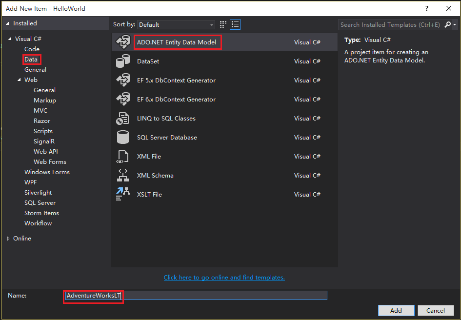 3.In the Add New Item - HelloWorld dialog box, click C# > Data > ADO.NET Entity Data Model.