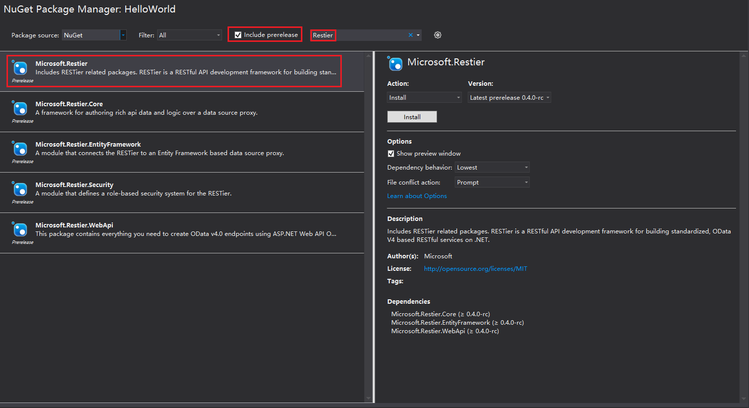 2.In the NuGet Package Manager window, select the Include prerelease checkbox.