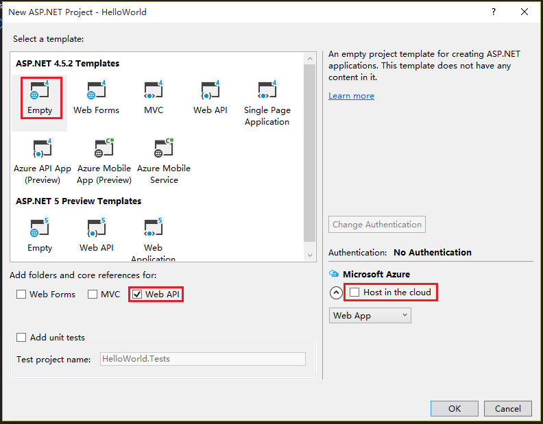 7.In the New ASP.NET Project dialog box, select the Empty template.