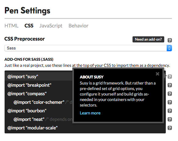 To access the list of available add-ons for your chosen preprocessor, click the "Need an add-on?" button above the preprocessor dropdown menu. That will open a list of the add-ons or plugins available for your preprocessor of choice. Instructions for how to use the add-ons in your Pen are shown above the list of add-ons.