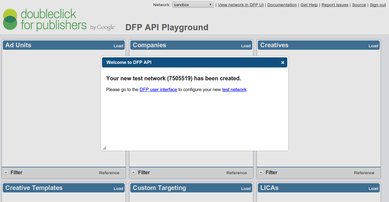 The new playground makes it simple for API developers to create test networks and get started with DFP API. All you have to do is log in with a Google account that’s not already associated with a test network and you will be prompted to create a new one.
