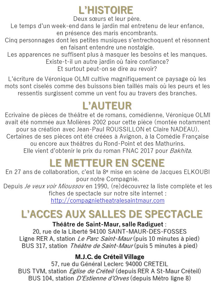 Pour ses 40 ans, notre compagnie jouera Le jardin des apparences de Véro Olmi 11 & 12/11 25 & 26/11