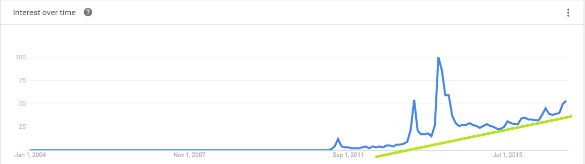 11. Global Google Trends interest for 'buy Bitcoin' is at 53% of the all-time 2013 bubble high. Steady growth this time (green line is my own)