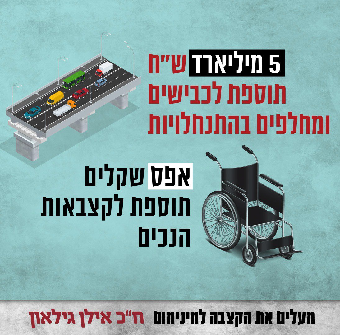 5 מיליארד ש"ח תוספת למחלפים וכבישים בהתנחלויות? יש כסף להגדלת קצבת הנכות? אין הגיע הזמן להגדיר מחדש את סדרי העדיפויות הלאומיים שלנו.pic.twitter.com/8LLLVopmXa