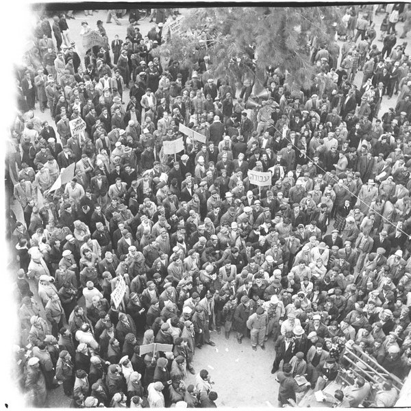 10. לארכיון המדינה דרושים: ארכיונאי ממשל ומרכז בכיר חומר מוגבל לעיון הגשת מועמדות באתר הנציבות בתמונה: קהל בהפגנה של מפ"ם בדרישה לעבודה, 1953