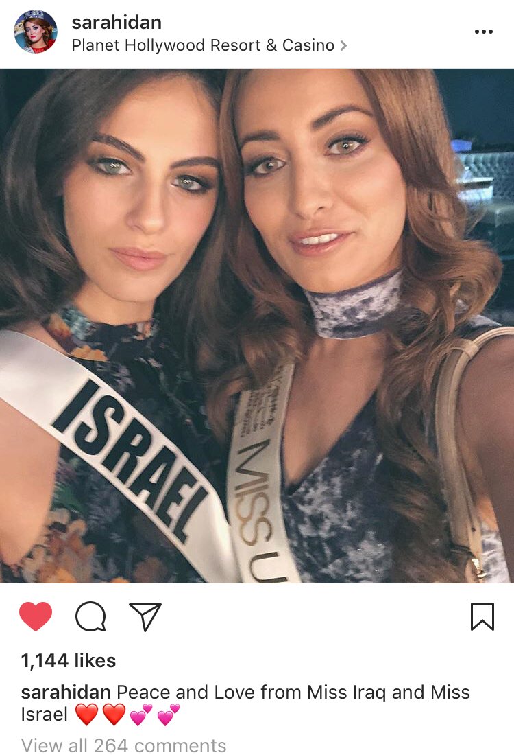 Miss Israel and Miss #Iraq pose together on#Instagram: https://www.timesofisrael.com/peace-and-love-as-miss-israel-and-miss-iraq-pose-together-on-instagram/?utm_source=dlvr.it&utm_medium=twitter …pic.twitter.com/5AJJCqWNT5