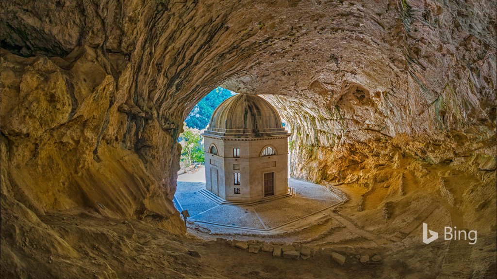 The white marble Temple of Valadier sits at the entrance of the Frasassi Caves in Genga, Italy.
