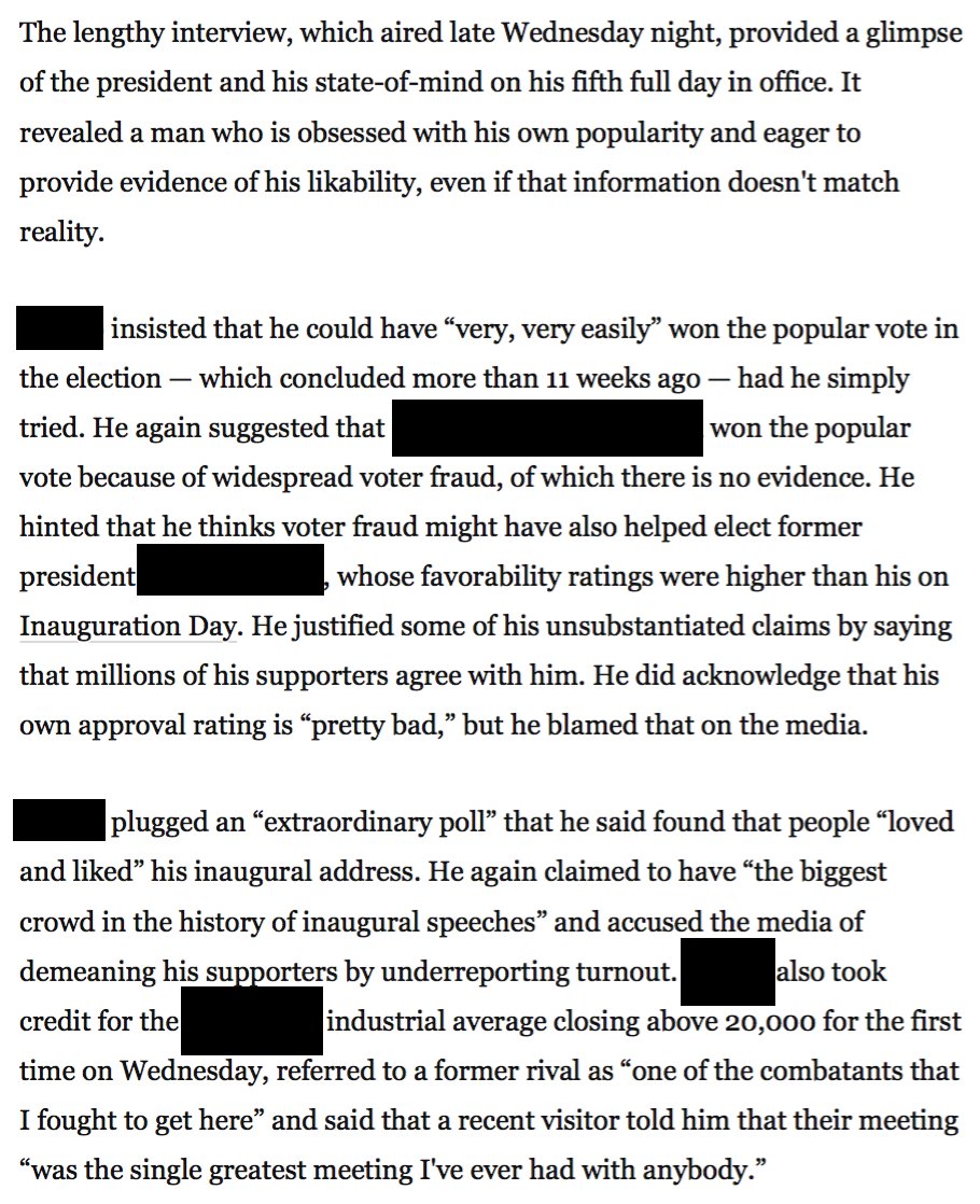 Lots of stuff like this: Trump can stand in front of/tweet about status quo and claim he is changing everything (drone strikes, econ, wall)