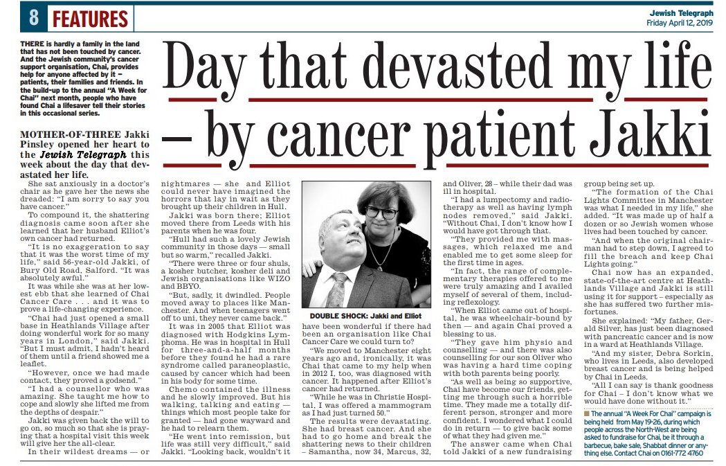 In the lead up to our 'A Week for Chai' campaign in the North West next month, Chai client, Jakki Pinsley gives an honest & personal account of what it's like to be told the words, "you have cancer" & how she discovered Chai. Thank you