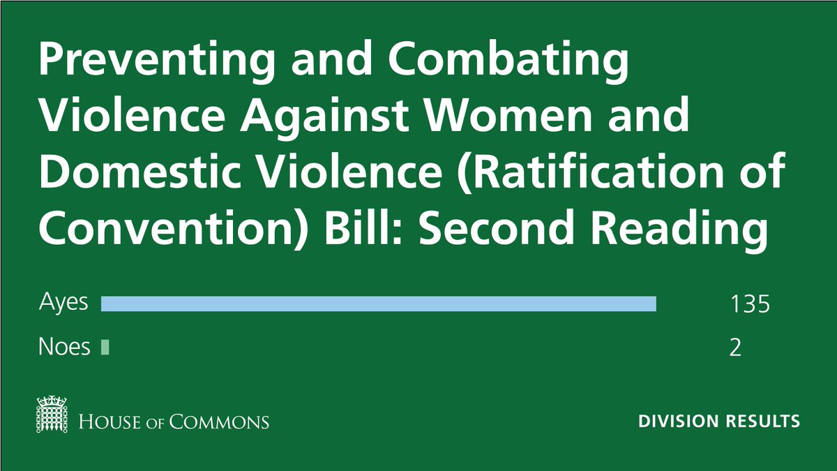 MPs vote 135 to 2 to approve Preventing & Combating Violence Against Women & Domestic Violence. The Bill progresses to Committee Stage.pic.twitter.com/srURl8q2in