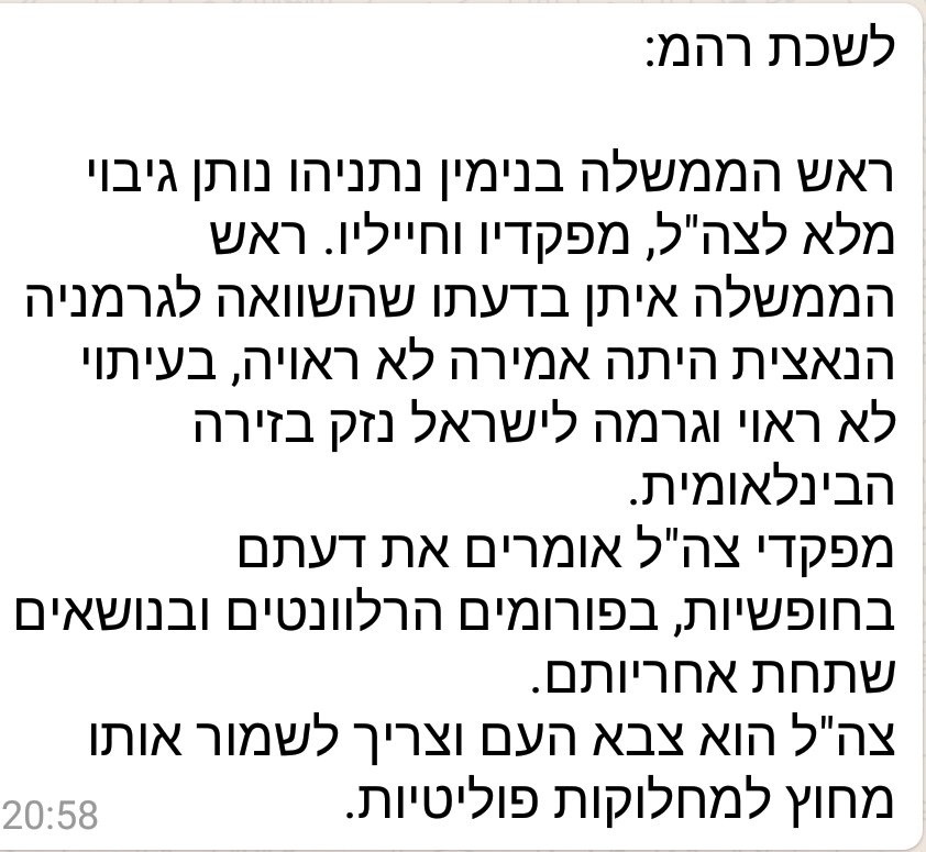 22. אכן מפקדי צה״ל, השב״כ והמוסד, מוסרים לקבינט ולממשלה את חחות דעתם המקצועית ונתניהו זורק אותה לכל הרוחות ועושה ההיפך