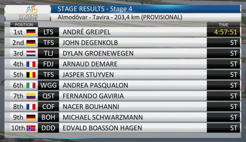 André Greipel (Lotto-Soudal) wins Stage 4 of the Volta ao Algarve. Top-10