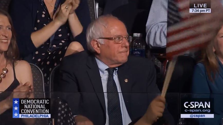 "I want to thank Bernie Sanders," Clinton says. Bernie smiles, briefly