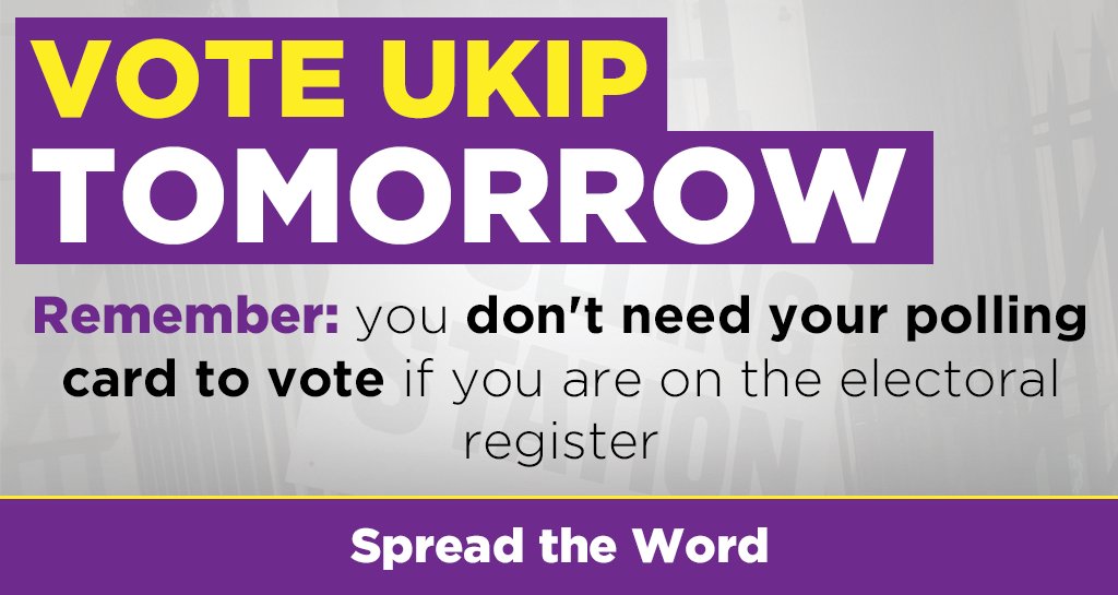 #VoteUKIP tomorrow. Remember: you don't need your polling card to vote if you are on the electoral registerpic.twitter.com/kUC0301rh1