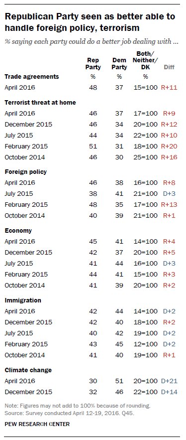 Republicans seen as better able than Dems to handle foreign policy, terrorism http://pewrsr.ch/1WK0qZ4 pic.twitter.com/EwUYzOkW2p
