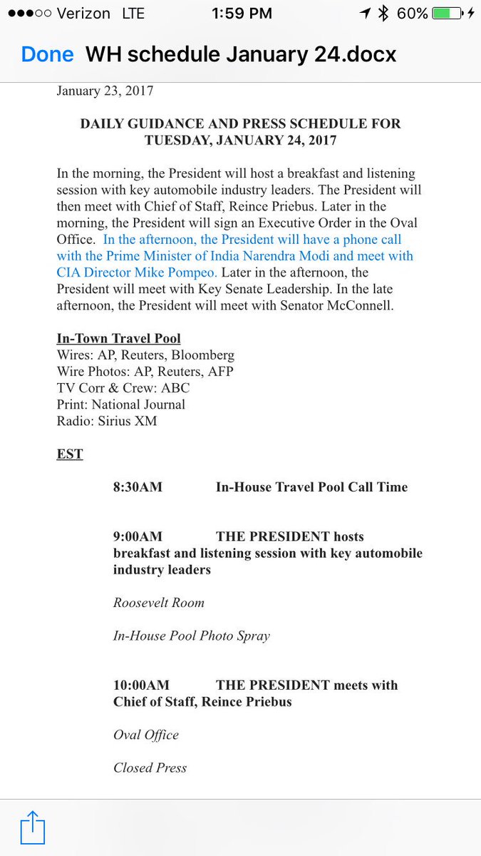 Incredible pace of activity in the Trump White House on week one - when have we seen a public WH sked packed as yesterday's & today's?pic.twitter.com/AtuHYCvuFb