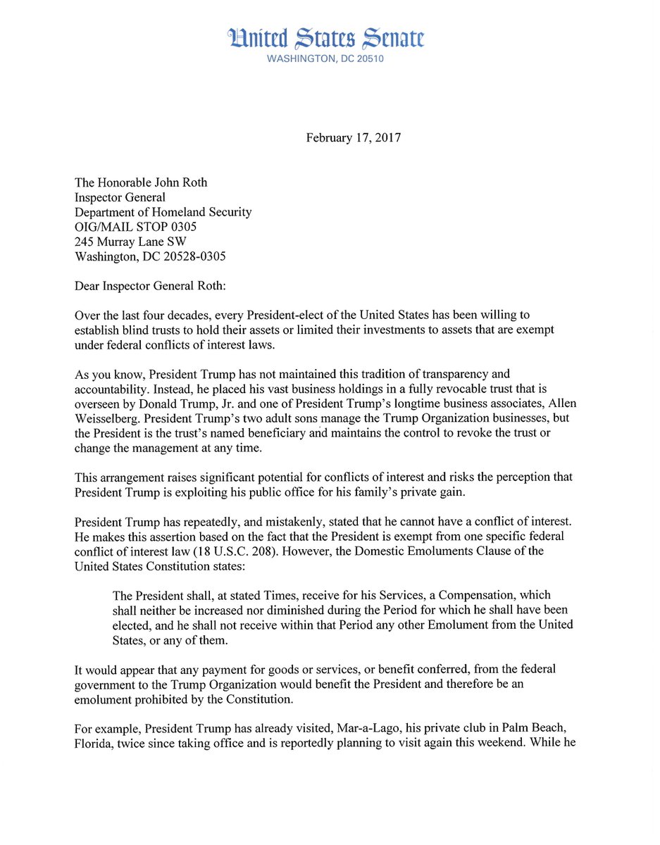 @SenateDems and I are demanding DHS IG Roth investigate whether@POTUS violated the Constitution’s Domestic Emoluments Clause at Mar-a-Lagopic.twitter.com/mJEnM6pARL