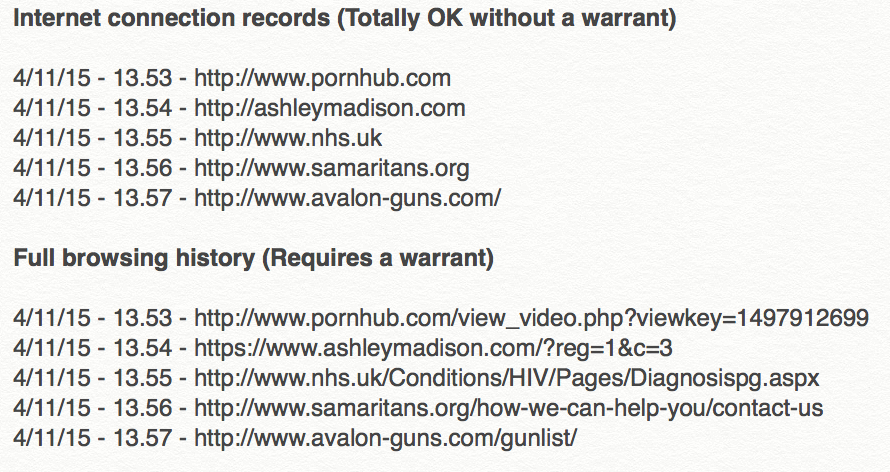 Some examples of the difference between Internet Connection Records (no warrant) and browsing history (warrant)pic.twitter.com/rDcjNqcTXa