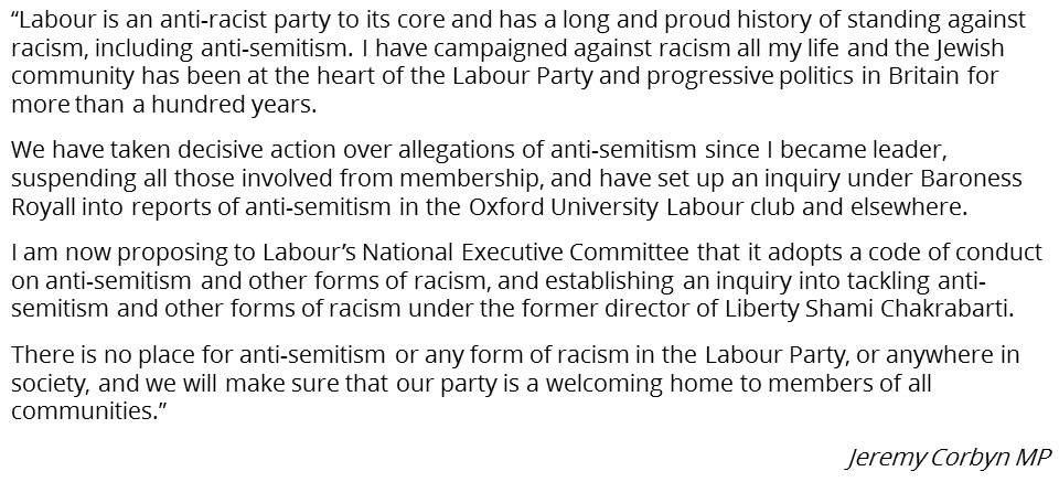 There is no place for anti-semitism or any form of racism in the Labour Party, or anywhere in societypic.twitter.com/iOnx9alAes