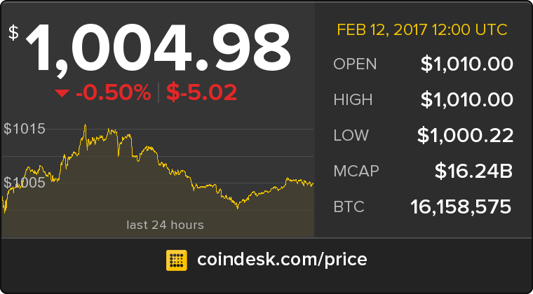 The latest Bitcoin Price Index is 1,004.98 USD