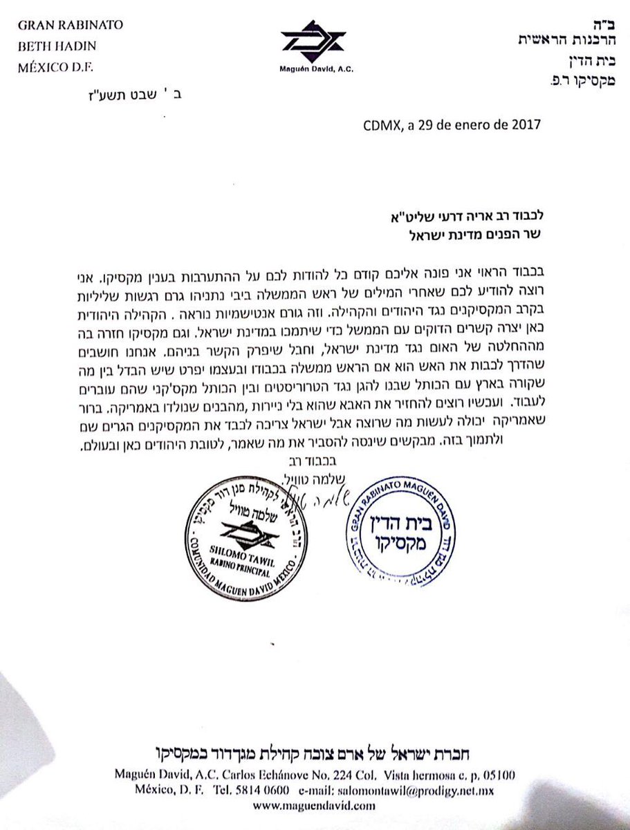 לאחר הציוץ של נתניהו, וההרגעה של דרעי, רבה הראשי של מקסיקו הרב שלמה טוויל במכתב לשר הפנים אריה דרעי: "המילים של רה"מ גורמות אנטישמיות נוראה"pic.twitter.com/MWXvWWAe2q