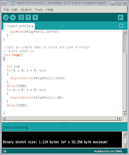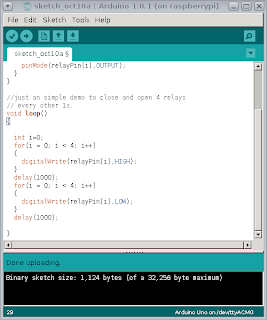 D'ailleurs, si on accède a notre Raspberry Pi par l'entremise d'un PC et de ssh -X, l'IDE s'affiche alors sur notre PC, mais roule sur le Raspberry Pi. Une fois que l'on a écrit du code Wiring (du C avec des fonctions spéciales genre analogWrite, digitalWrite etc), on clique sur le bouton avec la coche pour compiler.
