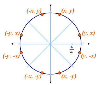 If you look at a circle, we can easily see that at a minimum, it is made for four identical quarters. And a quarter is mirrored around each axis. So, by calculating half of a quarter circle (1/8 of a circle, an octant), we have basically calculated all the points we need, simply by flipping the signs and axis.