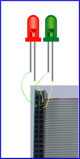 With the cable ready, we are now going to test it. Let's add 2 LEDs to do this test. We will use a red and a green LED, but you can use amber or yellow LEDs too. Blue, violet or white LEDs will not work, since they need more voltage.