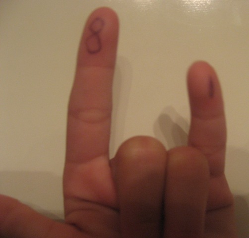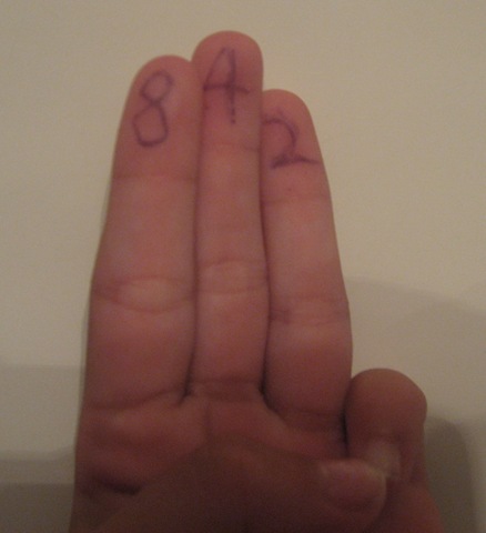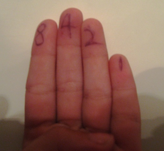 The analogous counting system with computers is to assign different values to each finger. Look closely at the following picture (click on it if you have to). You’ll notice the numbers eight, four, two, and one on the fingers: