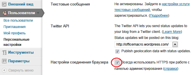 В этом случае можно использовать безопасное зашифрованное подключение. Для этого на странице ПользователиПерсональные настройки установите флажок “Всегда использовать HTTPS при работе с панелью администрирования и нажмите кнопку «Save Changes».