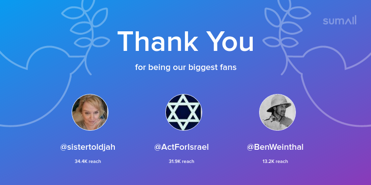 Our biggest fans this week: sistertoldjah, ActForIsrael, BenWeinthal. Thank you! via https://sumall.com/thankyou?utm_source=twitter&utm_medium=publishing&utm_campaign=thank_you_tweet&utm_content=text_and_media&utm_term=e2547e3a4539ed25c1e5fa66 …pic.twitter.com/jcVPRLV22x