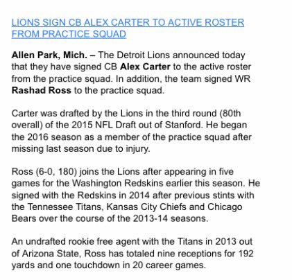 #Lions announce roster moves...Alex Carter signed to active roster, Rashad Ross signed to practice squadpic.twitter.com/GOvTKd0lOz