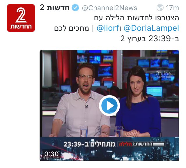 @DoriaLampel ו@liorf | מחכים לכם ב-23:39 בערוץ 2pic.twitter.com/0hcdzzCDey12:57 ಅಪರಾಹ್ನ - ಮೇ 15,2016 · ವಿವರಗಳು3 ಮರುಟ್ವೀಟಿಸುವಿಕೆಗಳು 22ಇಷ್ಟಗಳು -