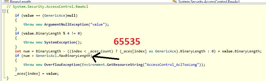 Just discovered the dotnet ACL length check to 65535 bytes (RawACL.setItem): "Length of the access control list exceed the allowed maximum" This impacts many powershell / c# code because the native editor/check are still working. A way to stop auditing tools?