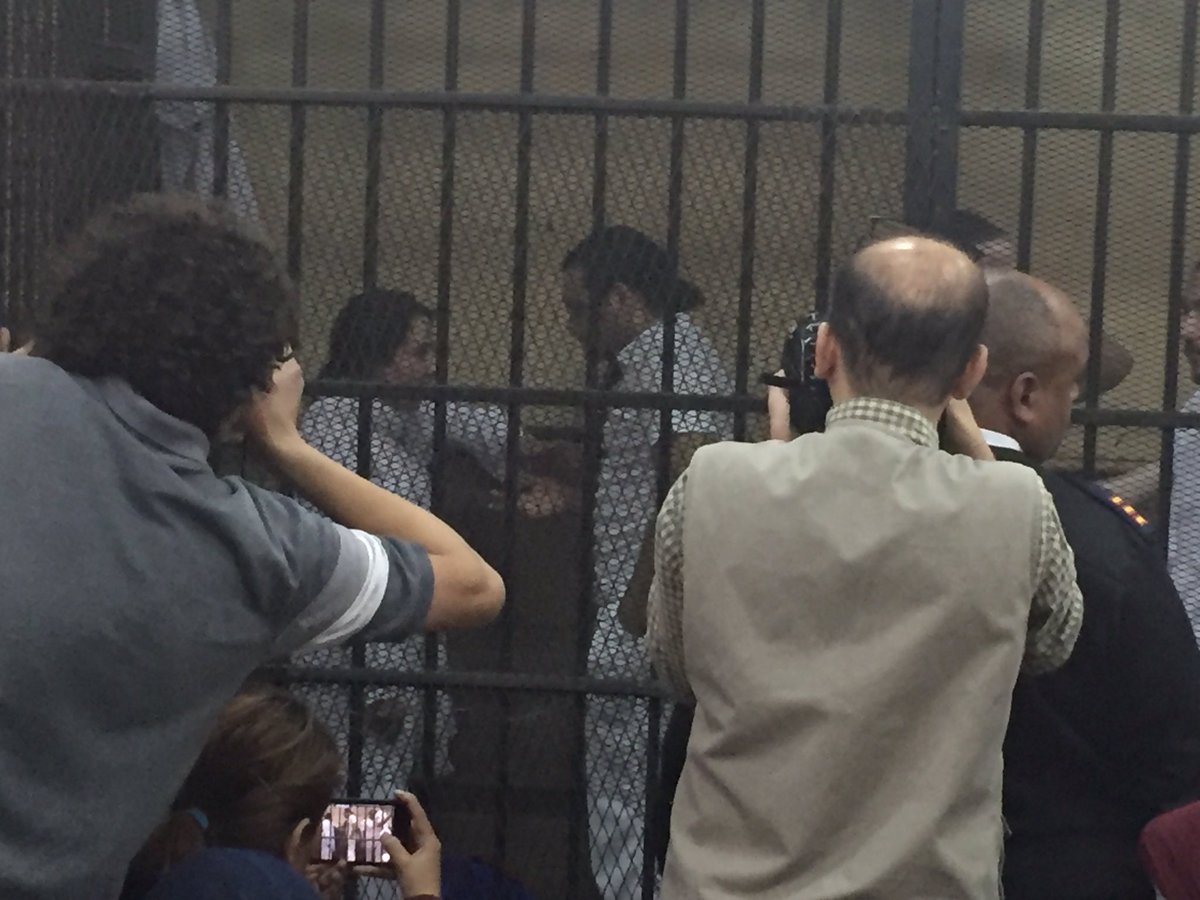 In Abdeen courthouse for verdict in Belady Foundation case. Aya Hegazy, her husband and other defendants brought in to defendants cage