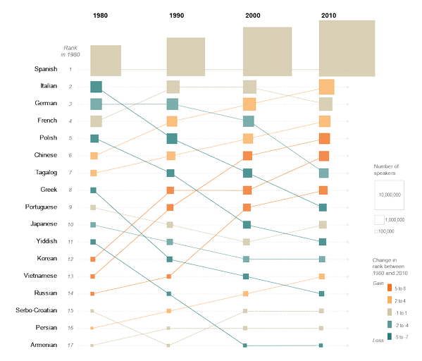 12. In 1980, Italian was the most commonly spoken language in the U.S. after English. In 2014, it's Chinese.