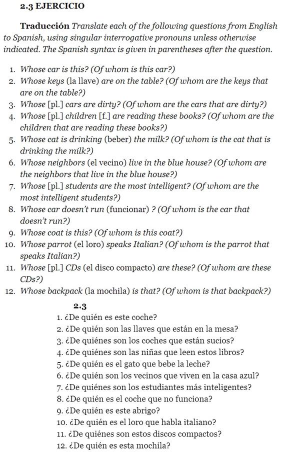 36. A quick exercise on "de quién," which is used to express "whose" in Spanish...answers included.