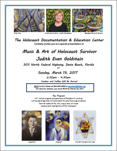 We are very excited to present Music & Art of Holocaust Survivor Judith Goldstein on Sunday, March 19th at 2:30 PM. Please RSVP to attend!pic.twitter.com/hMRx6dSL1C