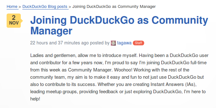 New blog post: "Joining DuckDuckGo as Community Manager" https://duck.co/blog/post/217/joining-duckduckgo-as-community-manager … /Daniel waves :-)pic.twitter.com/lwDP9GVsGA