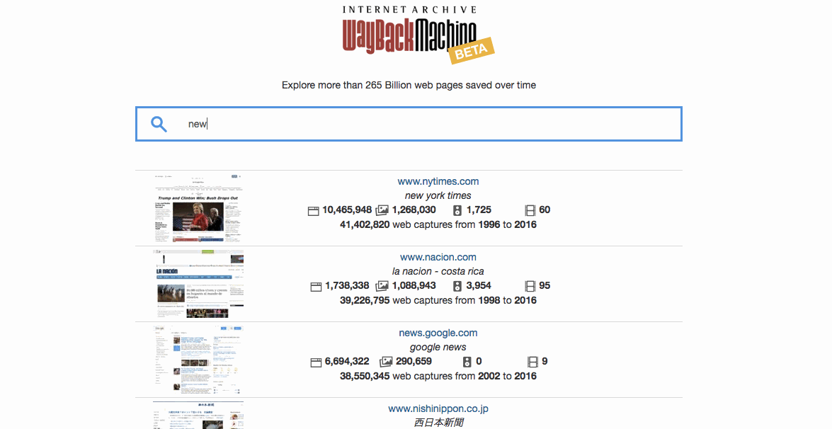 With this new beta search service, users will now be able to find the home pages of over 361 Million websites preserved in the Wayback Machine just by typing in keywords that describe these sites (e.g. “new york times”). As they type keywords into the search box, they will be presented with a list of relevant archived websites with snippets containing: