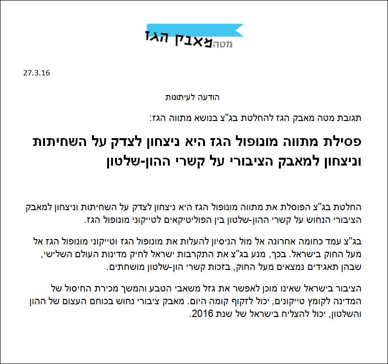 20. הטענות שלנו אף פעם לא כוונו לחברות הגז שדאגו לאינטרס שלהן, אלא לממשלה שלא דאגה לאינטרסים של האזרחים ושאר העסקים במשק