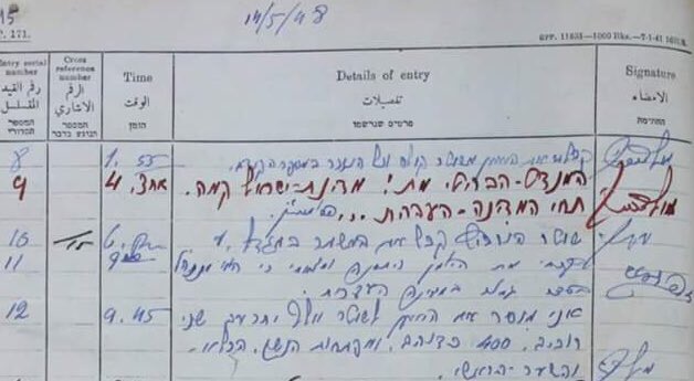 14/5/1948 שעה 4 וחצי, "המנדט הבריטי מת! מדינת ישראל קמה. תחי המדינה העברית״. אירוע מס' 9 ביומן בתחנת משטרת חדרה