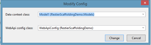 - Click “Change”. Scaffolding tool will add the code in “WebApiConfig.cs”. And add Restier assembly as reference