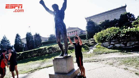 El delantero de la Selección chilena y de Arsenal se fotografió, en su día libre, en los escalones de Rocky del Museo de Arte de Philadelphia.