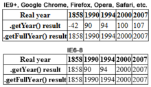 - JavaScript was changed due to the concerns of the Y2K bug, and the return value for years changed and thus differed between versions from sometimes being a four digit representation and sometimes a two-digit representation forcing programmers to rewrite already working code to make sure web pages worked for all versions.[12][13]