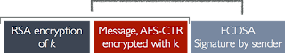 The outcome is that the user receives and decrypts a copy of the message, which has now apparently originated from the attacker rather than from the original sender. Ordinarily this would be a pretty mild attack -- but there's a useful wrinkle. In replacing the sender's signature with one of her own, the attacker has gained a powerful capability. Now she can tamper with the AES ciphertext (red) at will.