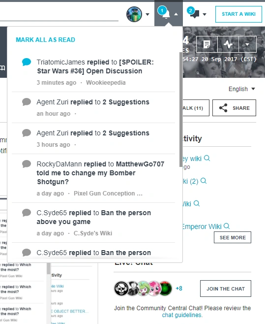 Notifications alert you to new messages on FANDOM or activity on a specific community. They help in keeping you informed of the latest events related to your community and your account. Notifications may appear in the upper right or lower right of your screen, depending on the feature.
