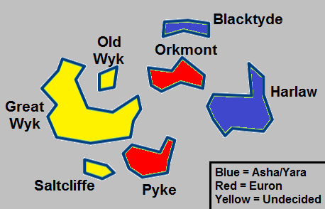 In the lead up to the Kingsmoot, Asha's main base of support is Harlaw, where here maternal uncle dominates as the head of House Harlaw. Euron, meanwhile, seized power over Pyke directly, using his plunder from across the world to bribe off various local Houses, often giving great largesse to weaker Houses or second sons to encourage them to usurp power over local Houses and take his side. Soon Orkmont was also swayed to Euron's side. Blacktyde also sided with Asha, favoring her pro-diplomacy platform and sharing her fear of provoking the mainland too far, but House Blacktyde is the only noble family from that tiny island. The Houses from the remaining three islands - Old Wyk, Great Wyk, and Saltcliffe - remain undecided and waver between openly declaring their support for one or the other.