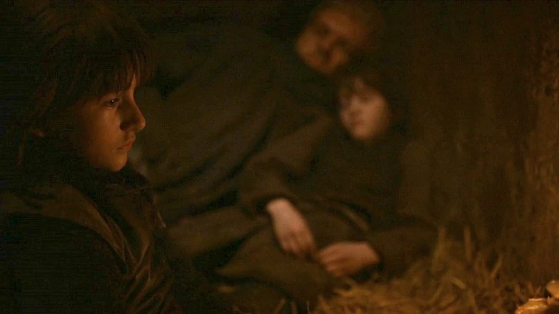 Luwin spots Osha sneaking into the catacombs. He follows her inside, and she explains that after reaching the farm she doubled back, using a stream to mask their scent from the hounds. Luwin urges her not to tell Bran and Rickon about the children Theon had murdered, but Bran is sitting up listening to them.